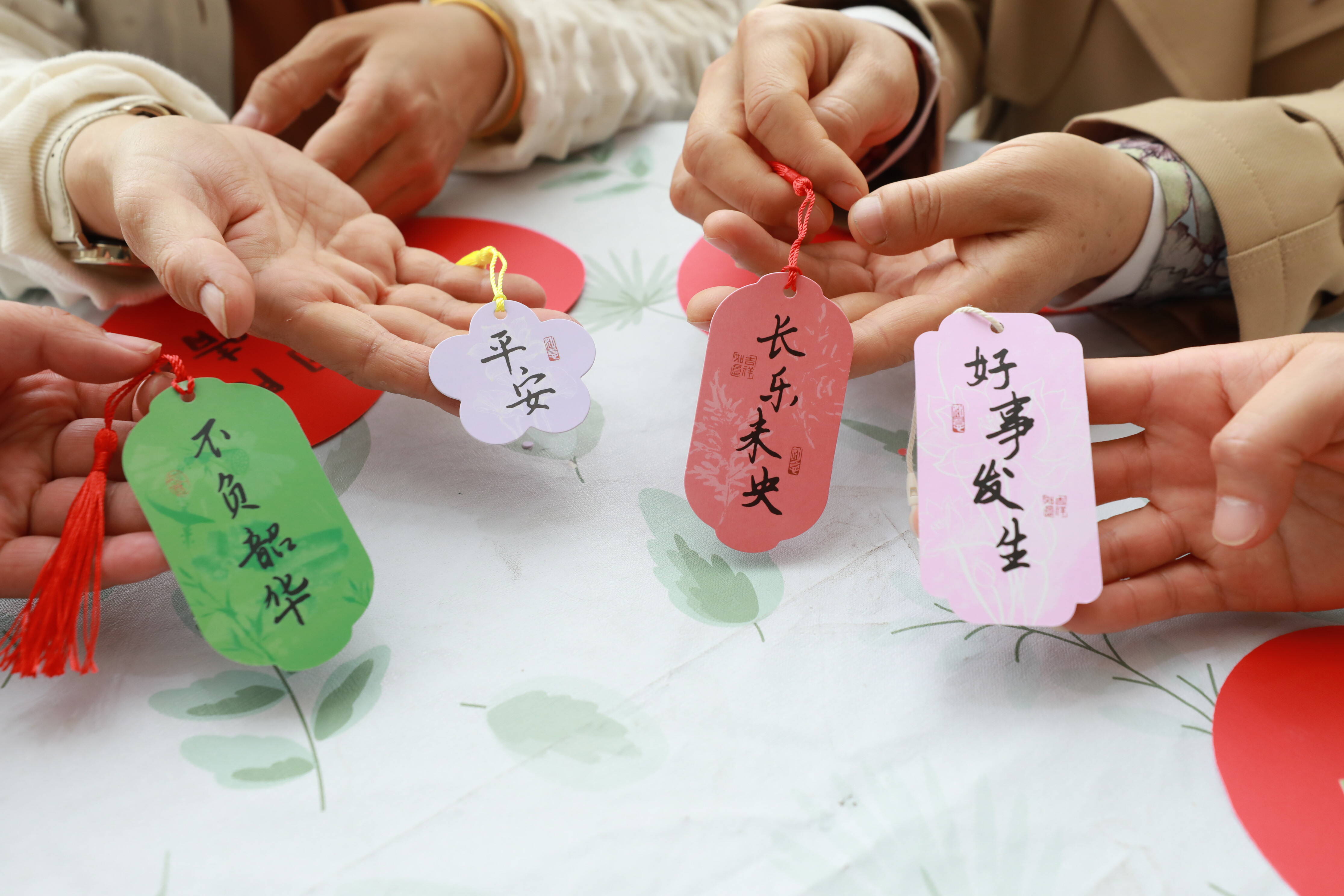 随即的创意手工书签制作环节。大家在“好事发生、长乐未央、平安喜乐、不负韶华”等字样的书签中化身巧手匠人,现场打孔、穿绳、系流苏……一枚枚独一无二的专属书签跃然眼前,传递着对美好生活的温暖期许。