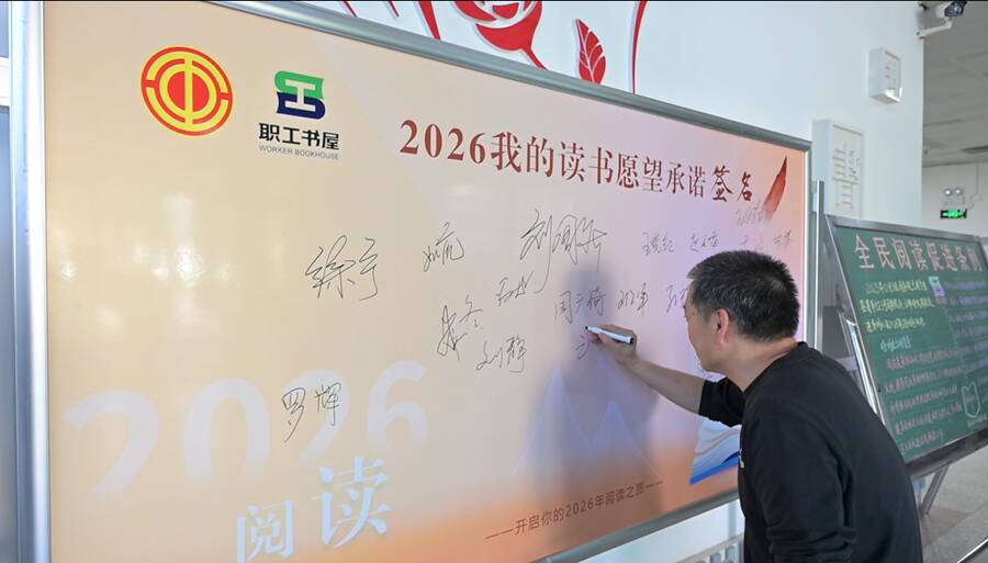 上午8时30分,泰和书院内,《全民阅读促进条例》宣贯黑板报与“书香山能阅见美好”活动展板分列两侧,中间是“2026我的读书愿望承诺签名”牌板。该矿儒学诵读协会会员、宣教小组成员、车间工会主席依次上前,在牌板上郑重签名,一笔一划间,立下2026年读书flag,写下对自我的读书期许,也写下“全员阅读、共建书香鲍店”的集体承诺。