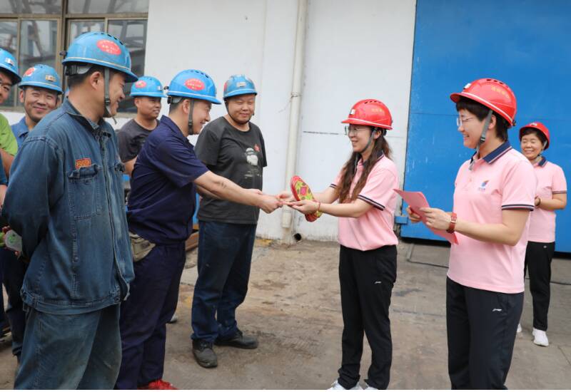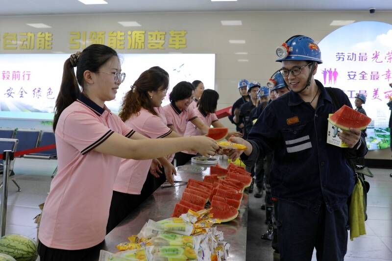 在井口大厅,暖心志愿者将沙甜西瓜、能量饮料、“洗护清凉包”、菊花茶等防暑物品送到职工手中,同步开放的冷饮机与除湿茶摊,让刚升井的职工们感受到丝丝清凉,正如综采一区李师傅所说:“这西瓜倍儿甜,真是凉在身上,暖在心里!”